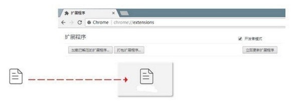 3.找到自己已经下载好的Chrome离线安装文件xxx.crx,然后将其从资源管理器中拖动到Chrome的扩展管理界面中,这时候用户会发现在扩展管理器的中央部分中会多出一个”拖动以安装“的插件按钮。