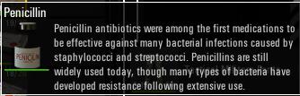 青霉素是第一个针对葡萄球菌和链球菌引起的细菌疾病的药物。虽然因为大量使用,很多细菌已经有了抗药性,但青霉素现在也在广泛使用。