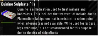 硫酸奎宁是用来治疗疟疾和巴贝西虫病的药物。这包括当青蒿酯缺失时恶性疟原虫能抵抗氯喹的情况下来治疗疟疾。由于有副作用的风险,不建议用来治疗抖腿综合征。
