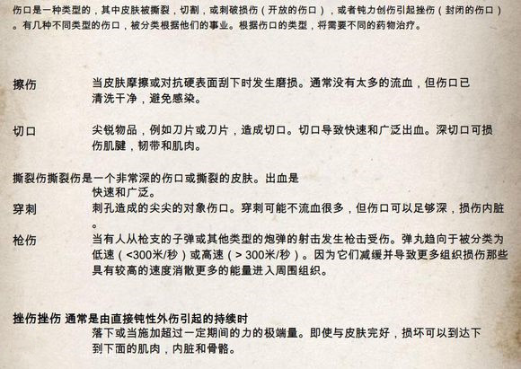 伤口是一种类型的,其中皮肤被撕裂,切割,或刺破损伤(开放的伤口),或者钝力创伤引起挫伤(封闭的伤口)。有几种不同类型的伤口,被分类根据他们的事业。根据伤口的类型,将需要不同的药物治疗。