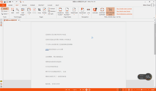 Nitro PDF Professional的界面与MS Office 2007异常相似,并提供四种色彩不同的skin以更换。Nitro PDF Professional的新建功能可以将Word文档、HTML档、文本文档、图像档等转换到PDF格式,然后提供多样化的编辑。还有PDF to Word功能,支援PDF转DOC,并与Office整合。【软件亮点】