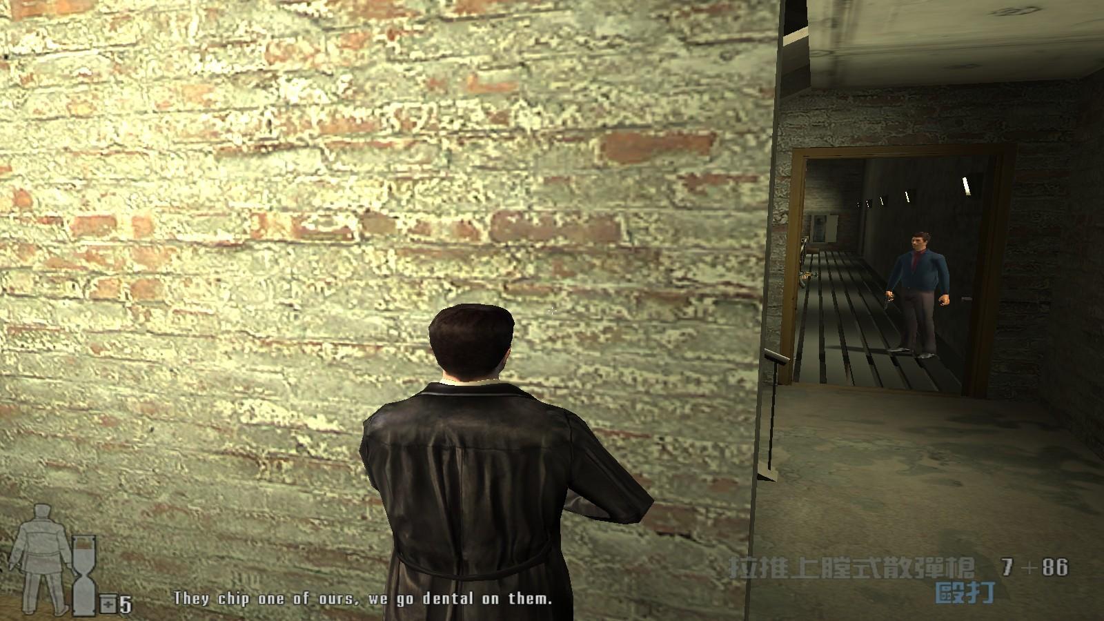 MAX尾追到一栋废旧建筑,在一楼大厅右边尽头的尸体旁检到血剂后沿楼梯一路杀上,打开一道门,里面正发生枪战,MAX杀入与友仔MIKE会合,上楼走到尽头一扇门开着的房间,解决掉里面的敌人,里面补给很多,捡!从房间尽头出去,沿楼梯杀上去,到楼梯尽头穿过黄色的门,杀完出现的敌人,左转出门沿楼梯一直杀下去,到二楼穿过右边的门进入房间,在尽头墙上绿柜得到补给,穿过右边门,杀死平台上的敌人后,从边上的脚手架下去后穿过对面的门,到一个大厅,敌人很多,又杀得天昏地暗!注意多存盘。一阵过场后,MAX干掉从一道门涌出的敌人后,穿过尽头的过道,MAX的杀入搭救了一名白衣男子。