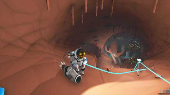 在探索过程中,需要随时注意氧气的存量,而如果你想要离开到远处(比如洞穴里)时,也可以采取在背包上存储额外氧气的方式。在地图中你能找到散落的资源(蓝色代表氧气),抽取成一个单位后,它就形成了[氧气]这种资源,电力也是同理。