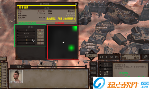 点击右下角勘探,可勘探处附近资源情况。土地类型影响种植种类,风速影响风力发电,水、石头、铁、铜是资源丰富度,肥沃度影响作物收成