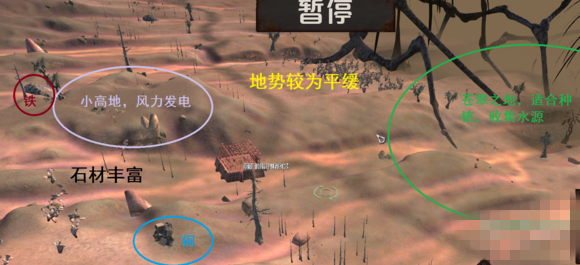 我这里找了一块戈壁与沼泽交界处,土地肥沃,地势平缓,偶尔有野生动物,资源齐全且丰富,还有一定风力。劣势是,会遭遇两块地形敌人的袭击。9.5分的地。