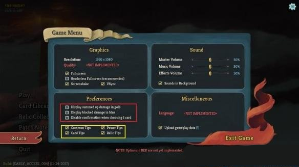 注意左下红框里的三个勾选项,分别是以金色数字显示战斗伤害,以蓝色数字显示格挡,第三项则是减少确认步骤(如果只选1张卡就不用确认了)。这三项都可以勾选。