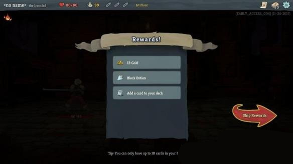 战斗获胜后你会获得金币、药剂和卡牌等奖励。