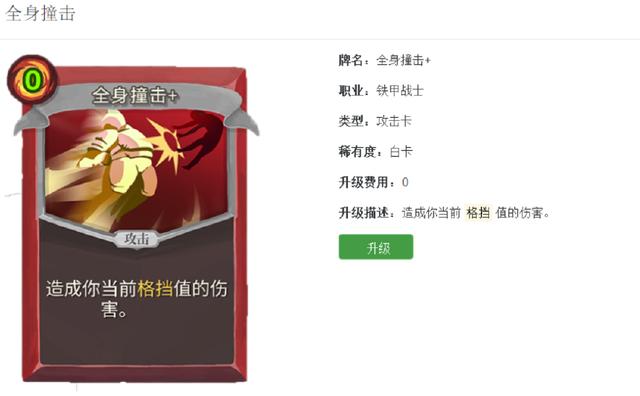 然后是全身撞击,这是一张一费攻击卡,升级后变成0费,这张卡的效果是造成你当前护甲值的伤害,也就是你的护甲越高伤害越高,这张卡是防战最重要的攻击卡,如果你没有这张卡的话,防战的攻击就真的是惨不忍睹。
