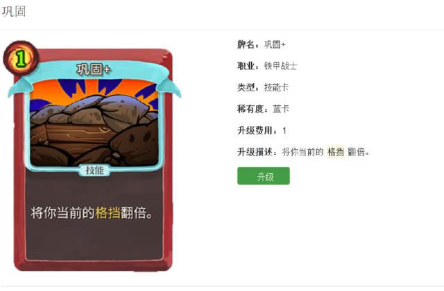 然后是巩固,这是一张2费的技能卡,效果是让你的护甲值翻倍,升级后变成1费,升级还是很赚的。这张卡虽然在低难度的时候用处不是太大,但是在进阶难度高的时候就非常的好用了。因为高难度你的护甲值要尽块堆高才行,所以这张护甲翻倍的卡牌就很重要了。