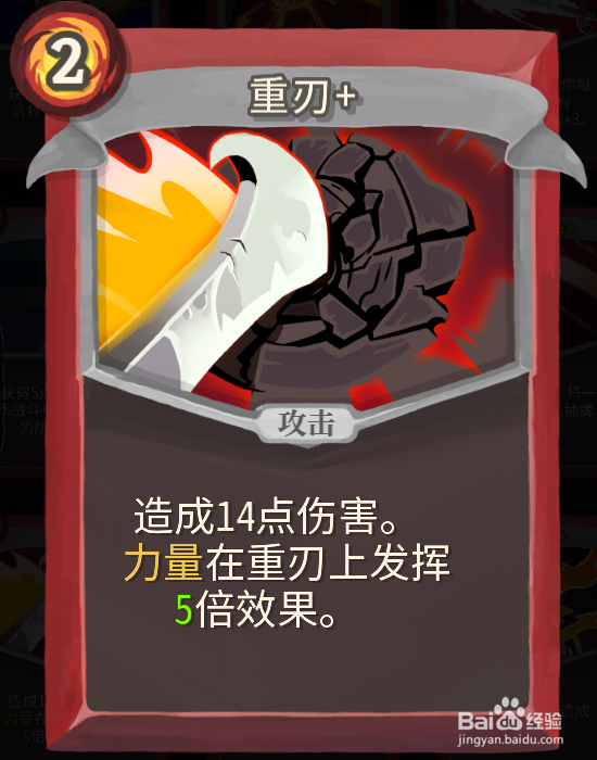 必备卡牌【重刃+】很多人会中途扑街的原因就是只顾着收集其他核心卡牌但是却忽视了这张牌。这张是神卡,为什么这么说呢?举个例子,对方有50血,我们有3费+活动肌肉。旋风斩的话是可以打12X3=36点伤害。而重刃的话是可以打18伤+5X4=38伤。用完后还剩下1费的,可以再用一发一费的旋风斩12,正好可以打50血。这个就搭配旋风斩来用,主要是打那些多个怪有一个血厚其他血少的情况以及单个怪的情况来用的。