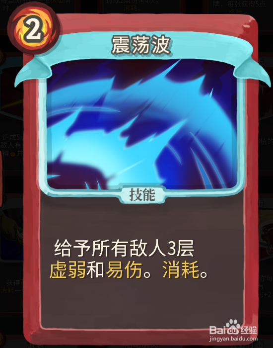必备卡牌【震荡波+】这个卡牌能给所有人重伤+虚弱效果。用法是如果我们没有抽到旋风斩的回合可以用它来给对手负面效果。持续5回合的负面效果足够我们抽到旋风斩或者重刃为止了,而且卡牌是消耗类的,用完后这回合就消失不会占我们的卡牌位。
