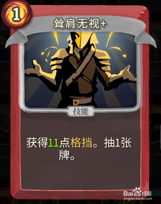 必备卡牌【耸肩无视+】这张卡是很常见的,之所以要屯一张这张卡是因为这个加成防御的效果中规中矩比其他主要加成防御的卡加的少,比防御加的多。关键的是用了之后有抽卡效果。之所以我们要选择一张防御卡是为了防止一些怪伤害过高,不至于杀不死它而被秒杀,而且有的怪有反伤,比如血量可能只有33的反伤怪,我们有5费,旋风斩打4下能死。那我们如果不防御的情况下是是受到至少12点的反伤的,用了防御是1点,低于6点的受伤都是能接受的,毕竟我们有回血。