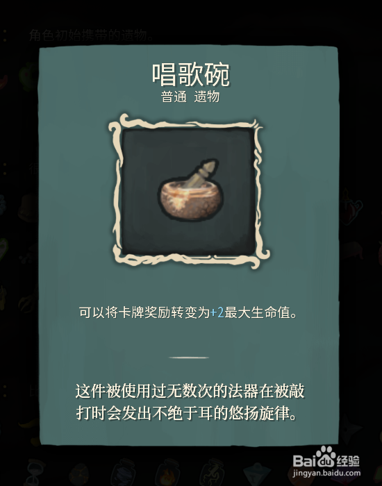 【唱歌碗】很好的遗物,不选牌能增加2点生命上限。
