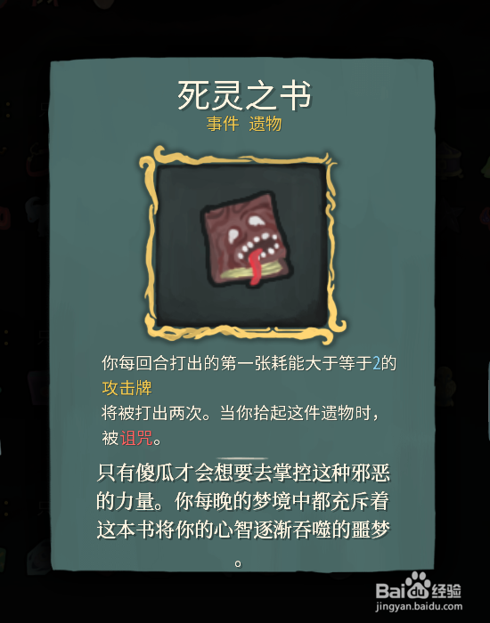 这个遗物的效果能让我们每回合的耗费2费以上的卡牌免费再打一次,相当于一个免费的双发,举个例子:我们有8费+双发效果+力量加成X2+重伤加成的情况下,我们可以打(12X8+48)X2=288点的伤害。而有了死灵之书后就变成了288+(12X8+48)=432点的伤害。即使是BOSS也不过400血。有了这个可以一回合秒掉BOSS。