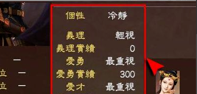 义理高的武将不容易背叛,并欣赏重视义理行动的武将。爱勇高的武将则欣赏在军事会立下成果的武将。爱才高的武将欣赏在内政,计略,外交立下成果的武将。对应价值观的就是 实绩,会因各种行动增减。