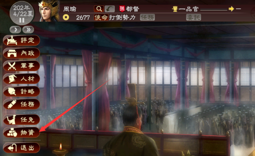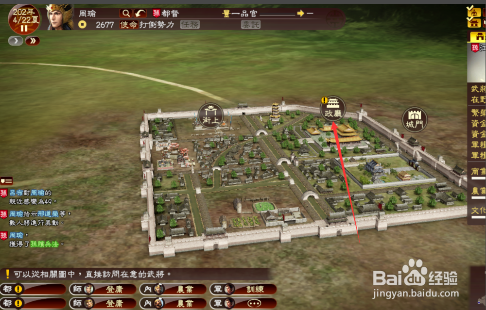 游戏里要实现输送物资的目的最好是都督或者君主这样的高职位的武将,然后我们来到据点的政厅。