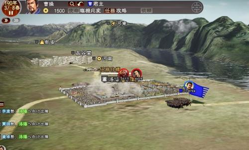 现在首要对手是曹操,派主要军团跟2个军团围攻,士变的同盟也快到期,让另1个军团去打就可以,曹操的势力很大,要在一年内攻下有困难,还是先以都市攻略为主,配合怀柔部落,3个军团一起打曹操。首先从中间进攻,将曹操军切开成两边,让他们不能互相支持,以5万多兵力挡住对方10几万的兵力,此时一个军团开始进攻洛阳,又攻下对方10几万的兵力,在我军英勇的进攻下,终于攻下洛阳救出皇帝了,然后另一个军团也开始进攻,没想到我的军团比我本队还要猛,一口气就攻下了好几个城池,并将虎豹骑跟青州兵的部落都占领了,以前就习惯把旧的都市给其它军团,自己把兵力集结在新的都市,可是这个游戏没办法集结兵力,让其它军团比我的军团还要强很多,不过这样也好,可以比较轻松去发展人际关系了,现在是201年10月,曹操只剩10几万兵力、4座城,已经不能威胁到我了,剩下的就交给两个军团就好了,这一年的目标改成灭掉曹操吧,我已经下达势力的目标及两个军团的目标,都是要将曹操军灭掉,接下来就没我的事了,我还是去怀柔部落顺便打发时间,等待曹操军被灭吧,另一个军团在打士变的势力也很顺利,看来也没我的事了,201年11月,与董卓的同盟只剩6个月,下一个目标放在袁绍,还是继续跟董卓同盟吧,于是又派出使者去交涉,就在我怀柔部落的同时,我的军团还在进攻曹操,终于在202年4月,曹操军灭亡了,这次我不想去登庸武将了,让我的军团去登庸他们就好了。