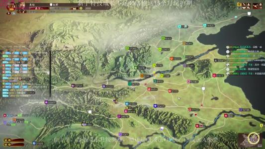 这时候分析天下大势,最强的势力是左上的董卓,大约有30万兵力,第二势力是下方的孙坚,大约20万,第三势力是我,比孙坚兵力差一点,左下方的士变威胁性不大,想要先拿下孙坚,结果打了一座城孙坚的兵力一直来,只打下一座城就后续无力,只好先停下来休息,这时候忽然发现,上方的袁术快被董卓灭掉了,赶快出兵,当然不是帮助袁术,是等董卓灭掉袁术之后把城池抢过来,又赚到10几个武将,这时候原本想先打董卓,但是当我开始要打第一个城市的时候,发现才打下一个据点还打不到一个城市,就已经兵粮耗尽了(董卓的兵太多了,一波一波一直来),只好改变策略,先跟董卓结盟,专心打下方的孙坚,孙坚的城市都隔很远,只能一步一步慢慢打,这时候不小心把整个势力的策略(上方的评定可以决定1年的策略),订为跟士变结盟,订完之后才后悔,不过既然已经订定策略了,那就专心打孙坚吧,之前给了一个军团最初的城市和一个富庶的城市,相信现在已经很强了,命令他帮我攻下孙坚的一座城,然后一边派使者去跟士变亲善及结盟(任务完成马上下一个任务,就不用跑回来了),于是我一鼓作气花了150天刚好将兵粮耗尽的时候,攻下了最后三座城(真的有够远),平定了整个东南方(那不就变成东吴了?)