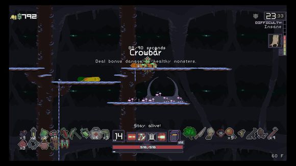 比如说这个, 在每个敌人旁边刷出一个幽灵为你作战。 撸主第一次中等难度打到最后一关靠的就是它了, 每次开传送门的时候找个可以攀爬的绳子,先干掉水母或者是蜜蜂这种飞行怪,然后就可以在绳子上用它清怪了(尽量爬高一点免得被小导弹打到)