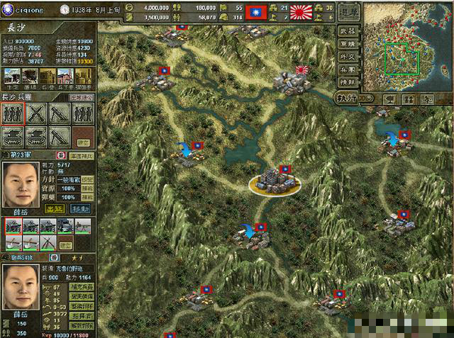 在正面战场上,小编自己是尽量不和对面发生火拼,当然如果对面真的来打我们的大型城市我们肯定是不干的,九江能守就守,守不住就推到南昌,但是南昌不能失守,杭州和金华也是一样,守不住就退到南昌,襄樊也是尽量守住,但是小编在游戏的时候襄樊失守,南郑也失守,然后就强行守一个西安,相当于自己被包围住了;我们把后方的城市的部队尽量拉到前线抵抗。