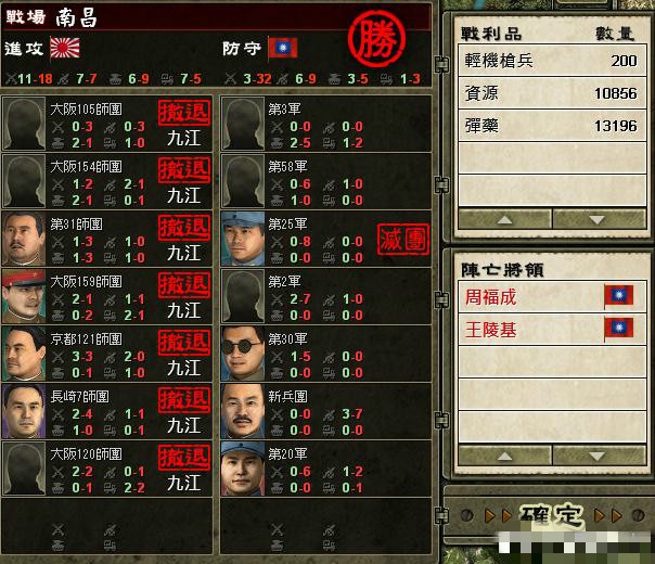 小编之前在南昌打了一场防御战,敌人就这么突如其来的进犯了,对面要么不来,要来也是集结了大批的兵力,7w的兵力对抗我们的6.4w,最终我们是以损失了32支步兵队,8队炮兵,5队坦克和3队补给车死守住了南昌,于此同时还阵亡了周福生和王陵基大将,哎哟,心痛死小编了。