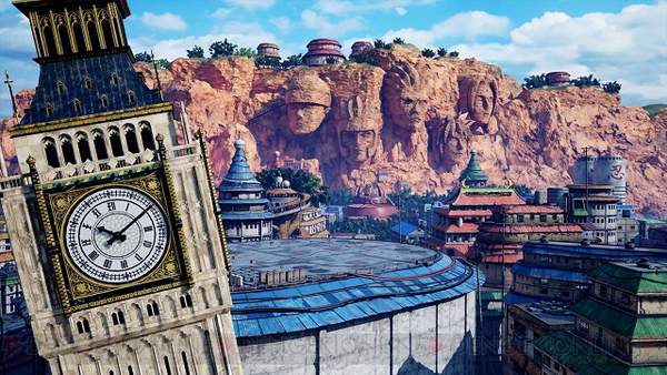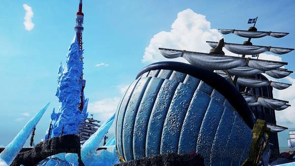 马林梵多岛海军本部作战的舞台。环顾四周,可以看到《海贼王》中出现的“白胡子海贼团”的船“莫比·迪克号”和被冰封的东京塔。