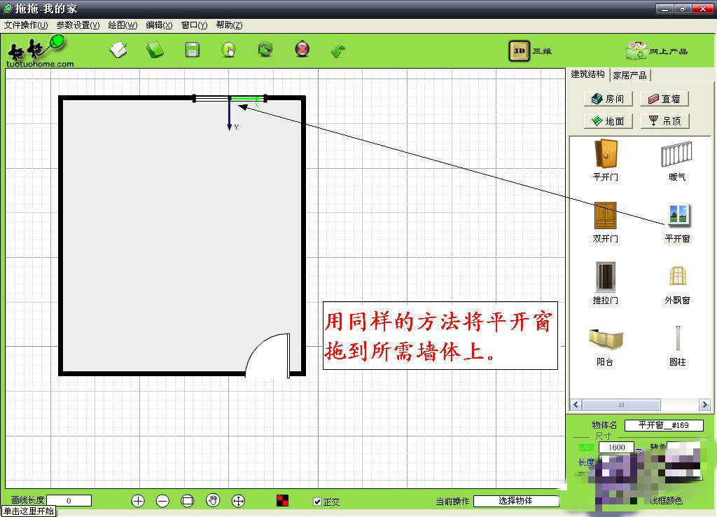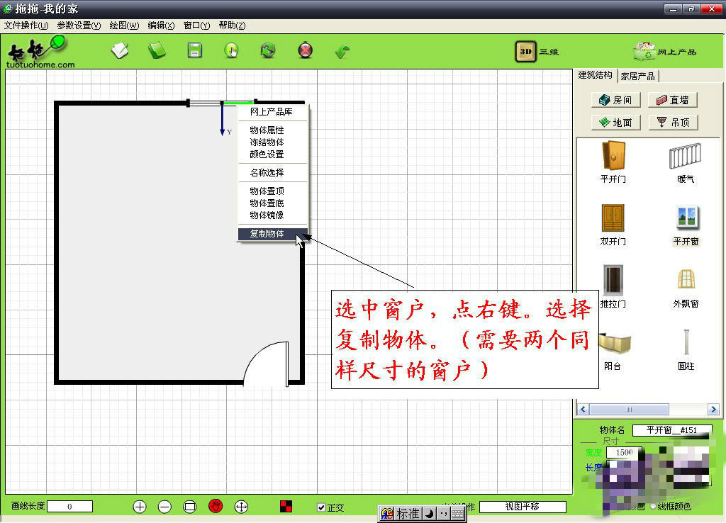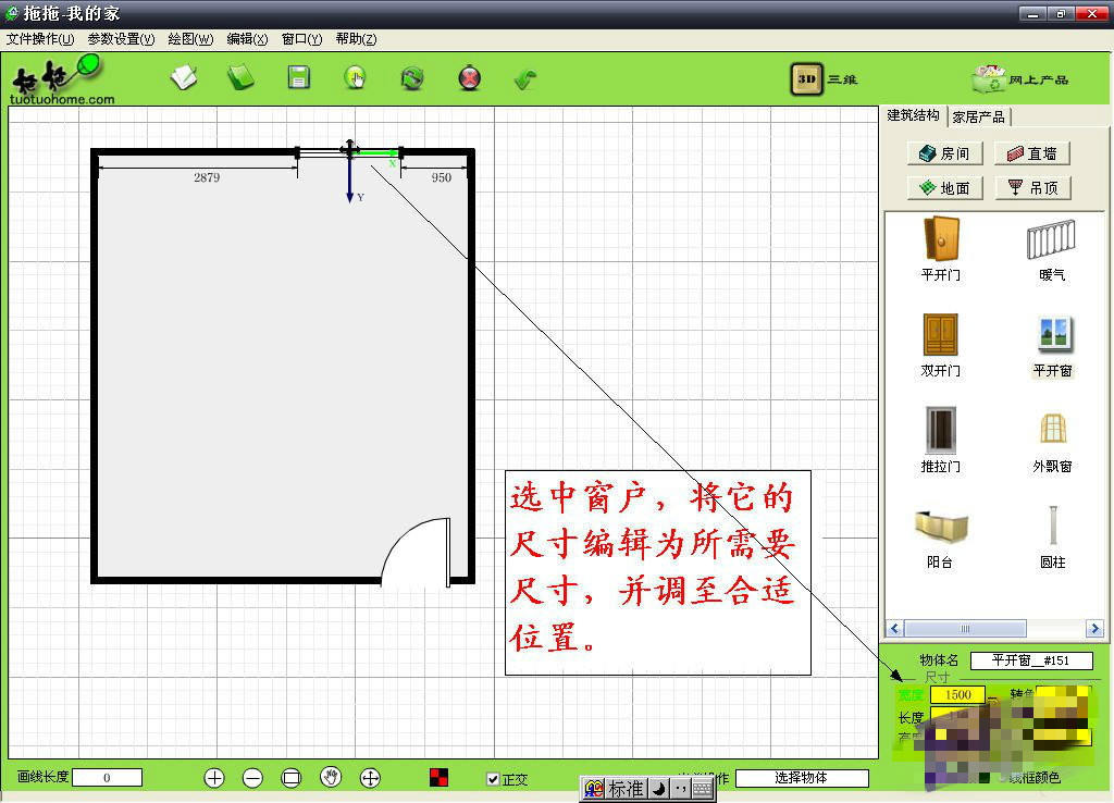 编辑窗户的尺寸为: 宽1500 长110 高2200 标高250
