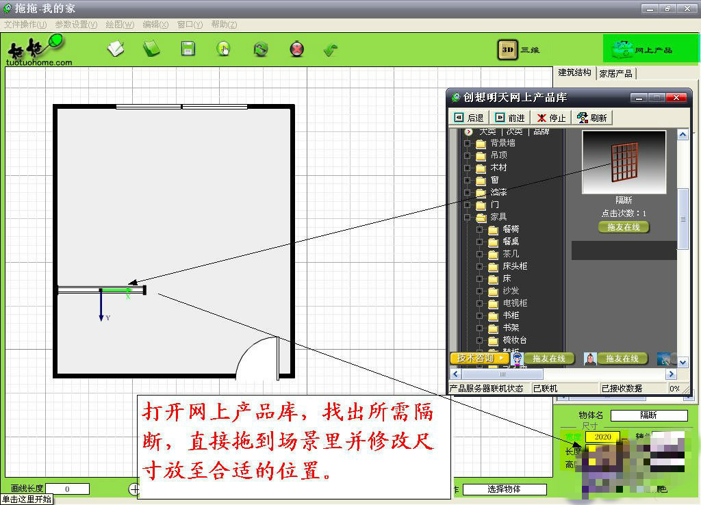 布置隔断:从网上产品库拖下后编辑尺寸: 宽2020 长150 高2550