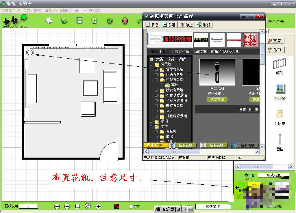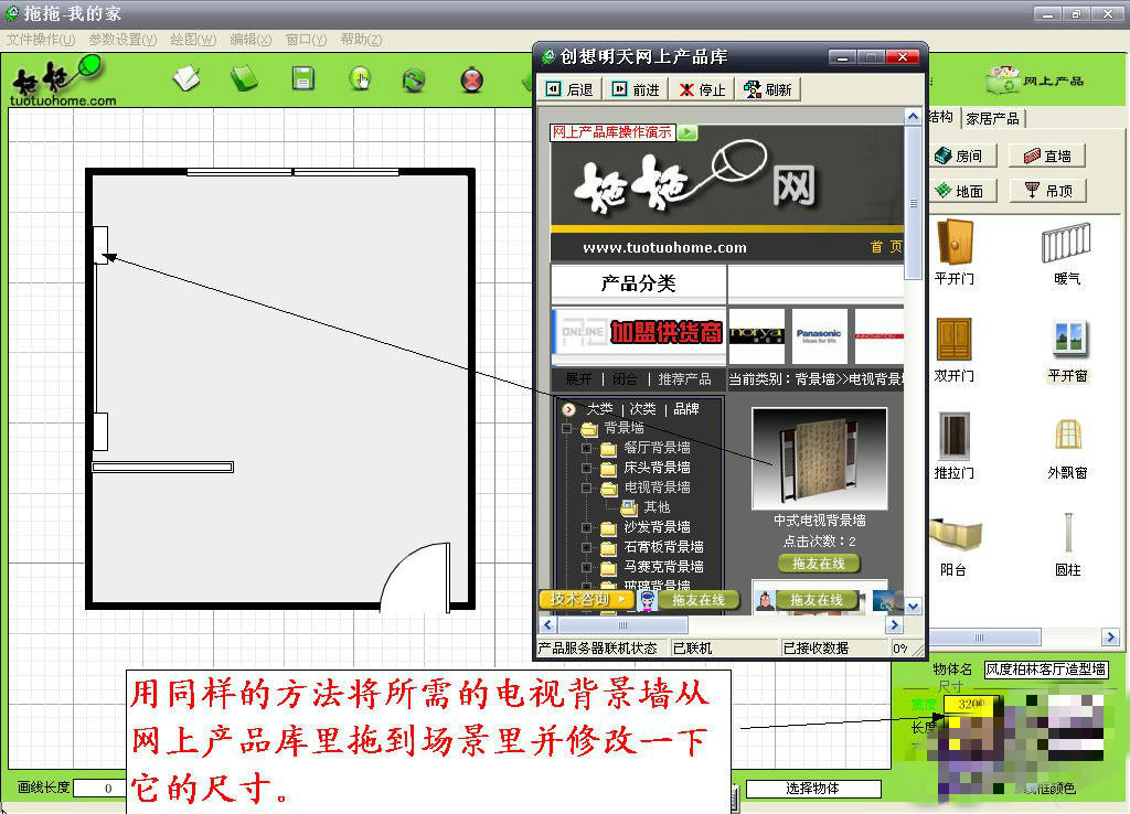 布置背景墙:从网上产品库拖下后编辑尺寸 宽3200 长200 高2800