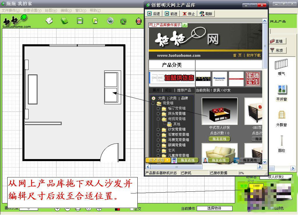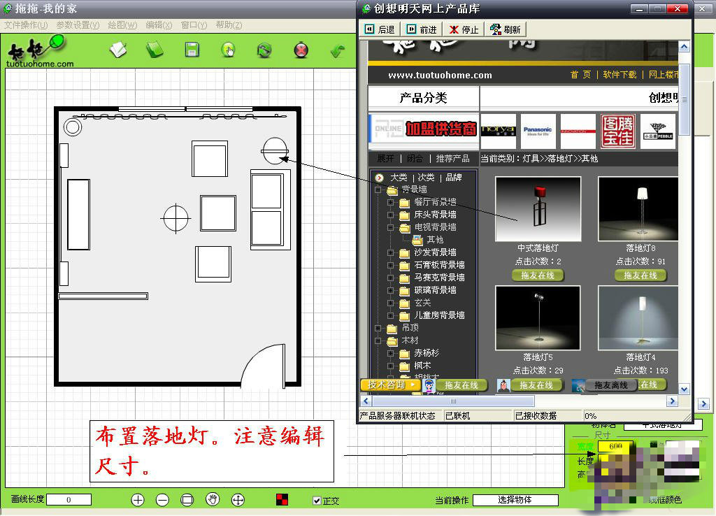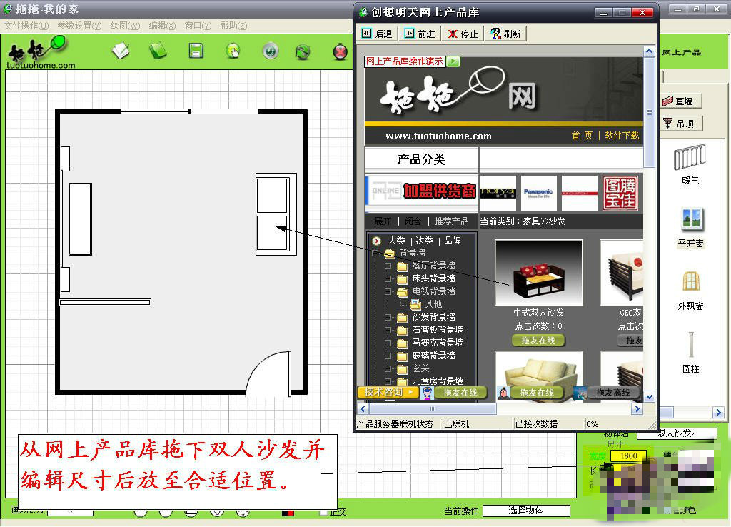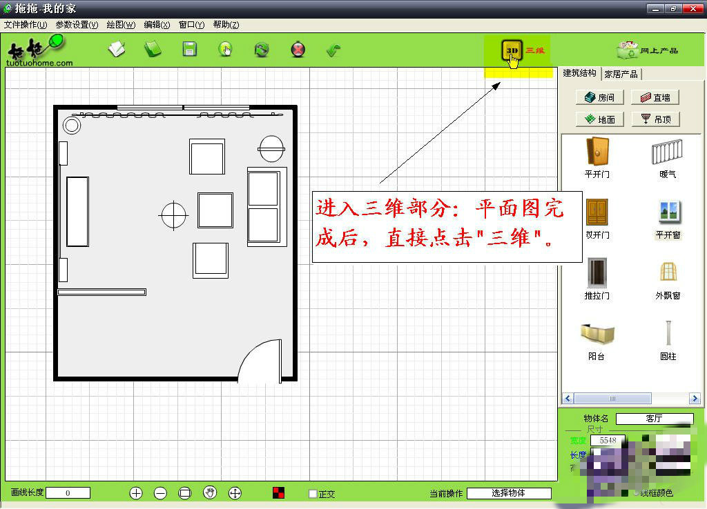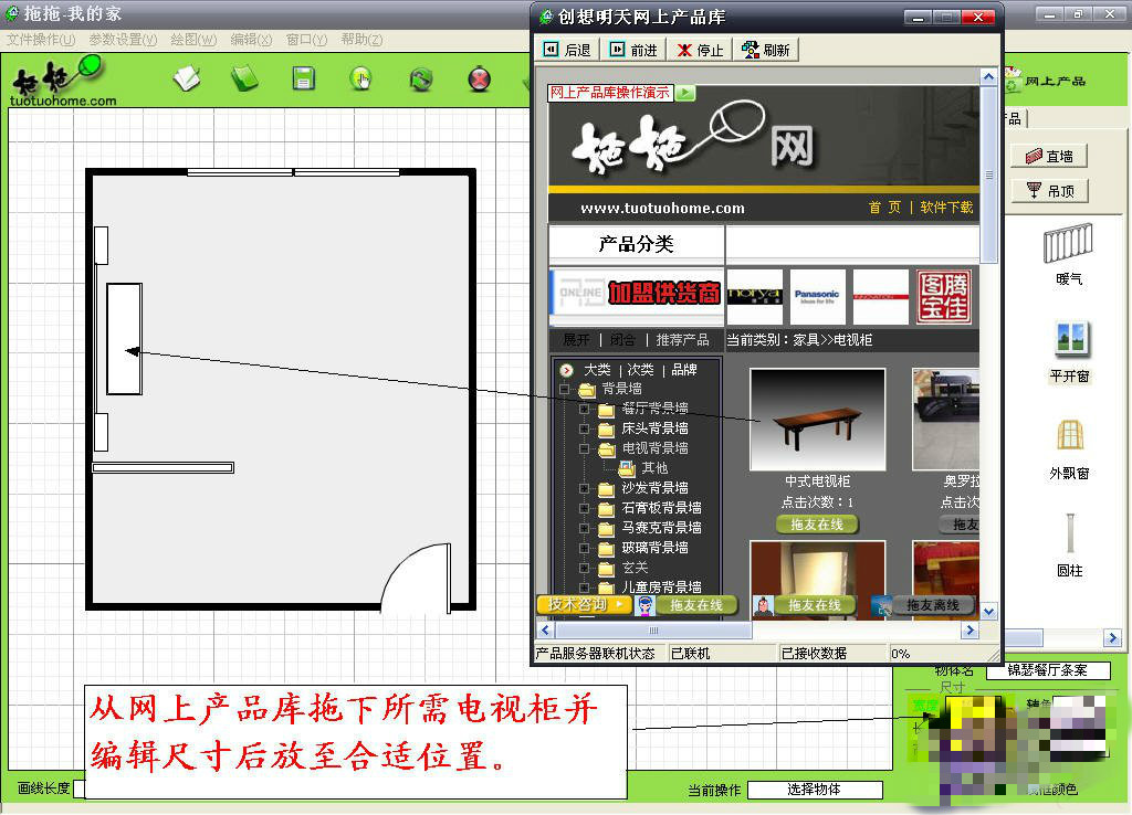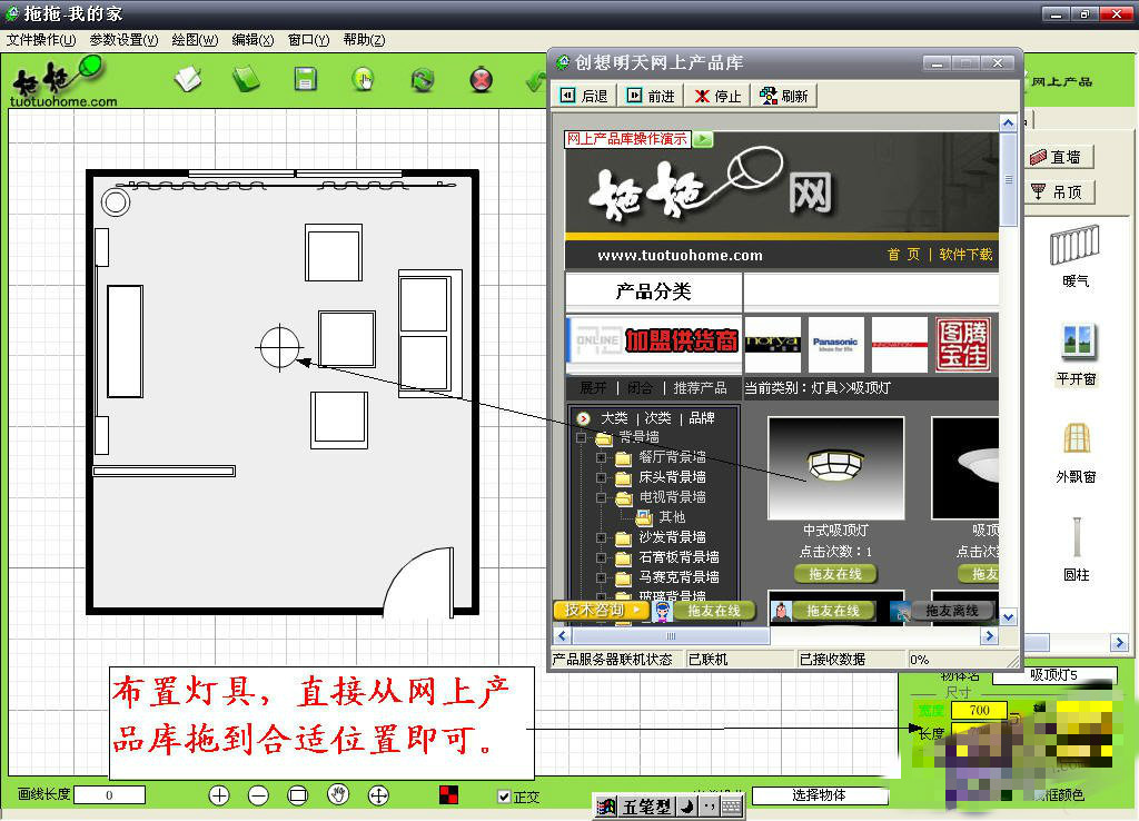 拖拖我的家是国内第一个可视化家居DIY互动平台的家装DIY软件,可以自己家的电脑上面进行装修设计的软件,是国内功能最强大、最专业、集三维家居设计、工程预算功能于一体的室内装修软件。任何用户使用拖拖我的家不仅可以在几分钟内绘制精确美观的二维彩色平面图,而且可以立即生成逼真的三维虚拟现实空间,并可实时动态地调整材料和灯光效果。