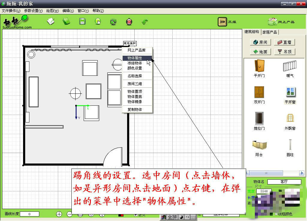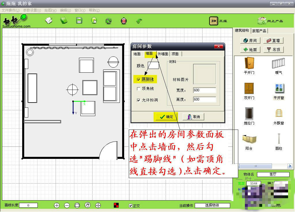 设置踢角线(如果是矩形房间选中墙体点右键从物体属性里编辑。如果是异形房间需选地面点右键从物体属性里编辑)