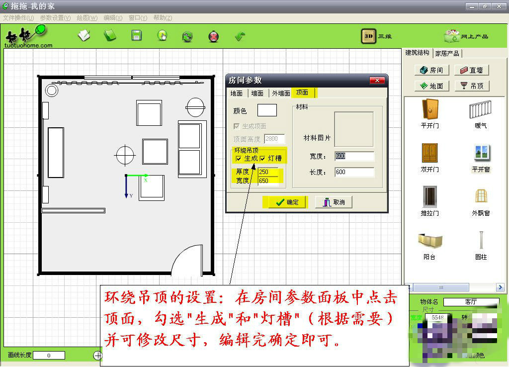 设置环绕吊顶(可根据需要勾选灯槽)这里我们按默认的尺寸生成。