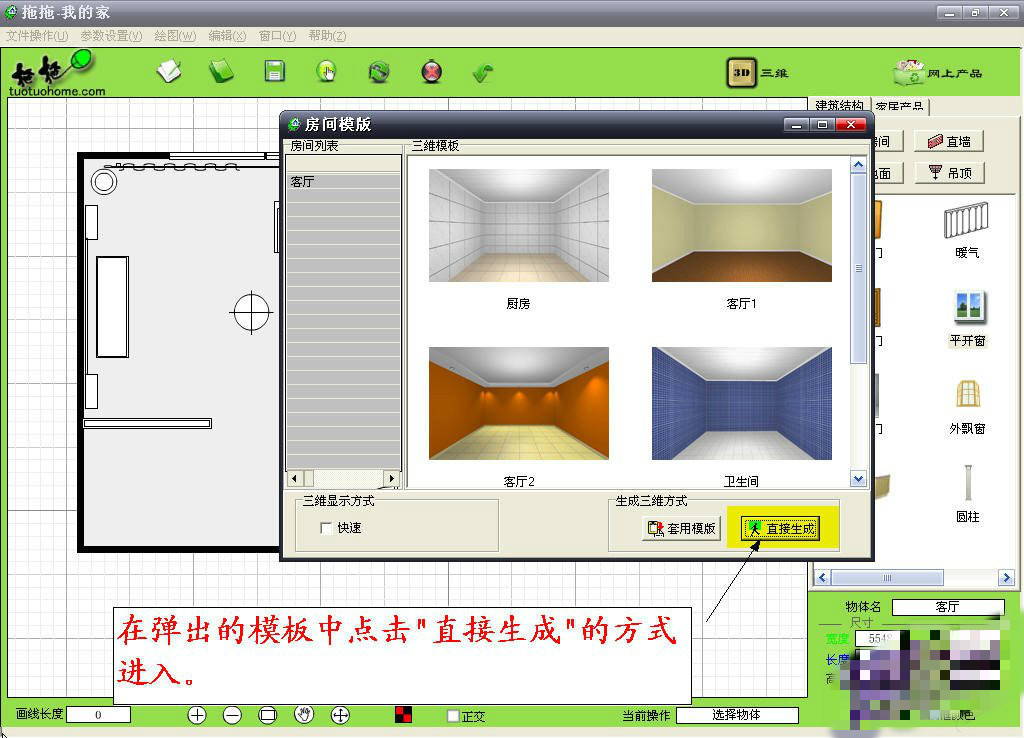 在进入三维时有几种方式(多房间时勾选快速。可双击房间图片套用模板方式生成的顶面、墙面与地面材料与模板中的相同)