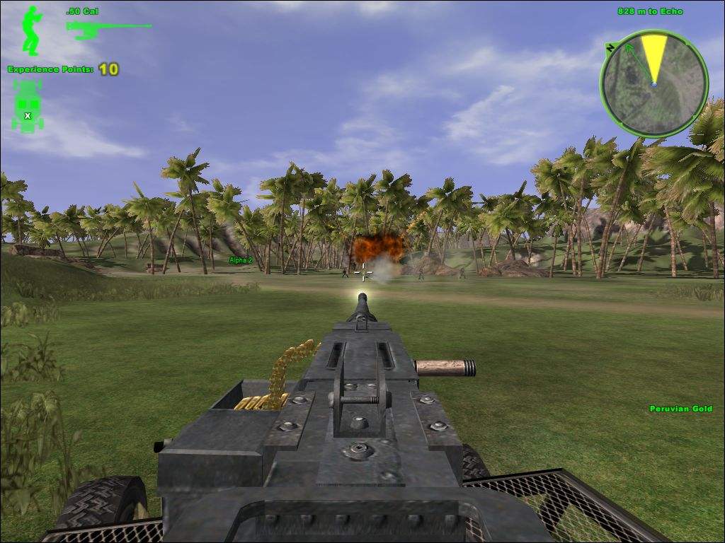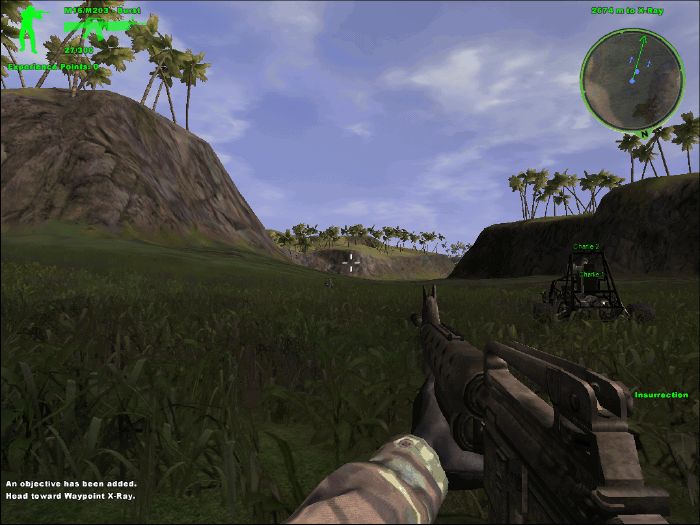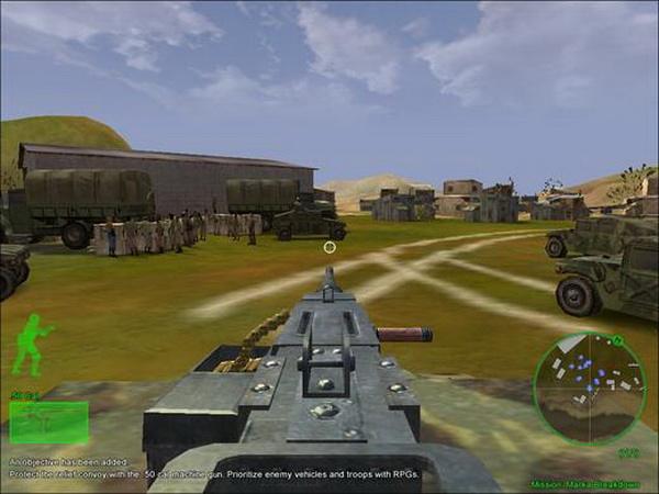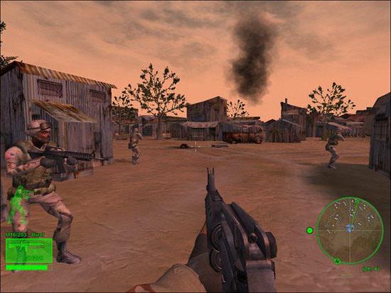 山谷村庄战。点shift键上车,和队友一起攻击前进,路上把几个摩托兵和一架直升机灭掉。到达敌村庄后,4名队友会分别包抄左右两边,主角只需要配合队友全灭村庄内敌人即可。确认没有遗漏后,在一个木屋中发现一个像洗碗机一样的东西,是GPS系统,几枪打爆,过关。本关难度很小,队友几乎包办了一切,建议用M16,难度1星。