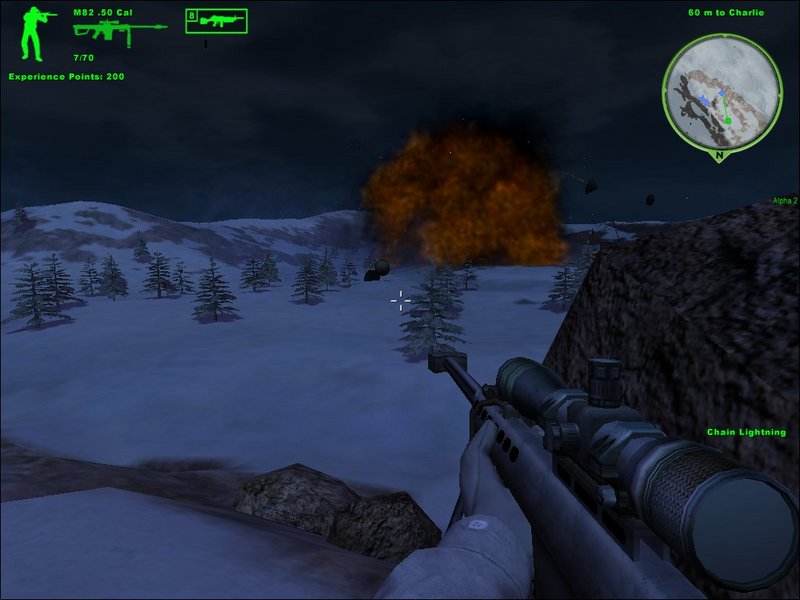 雪岭夜战。本关的主要任务是按照地图指示,到达指定地点侦察,通知空军炸掉目标,主角的任务是配合侦察。一开始在面前的山坡找个好瞄准的地方趴下,开始秒人,这个点的敌人冲出来都是一条直线,很好打。完成后沿着地图到达指定地点,导弹轰炸后,先不要冲下去,等一等会有辆装满人的军车开过来,送颗火箭给他们,然后就在山坡上协助队友狙击。敌人消灭完后和队友会合,顺便补充弹药,还捡了把重机枪(爽啊),沿着地图到达第2指定地点,再次轰炸,再炸掉一辆军车,抱着重机枪向下冲,清完人后,坐直升机离开。本关难度低,几乎所有的敌人火力都被队友吸引了,主角要做的就是到达预定地点,打打冷枪,清理巡逻队而已,建议用狙,难度1星。