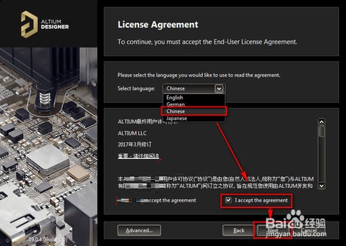 选择Chinese,勾选I accept the agreement,点击“Next”。