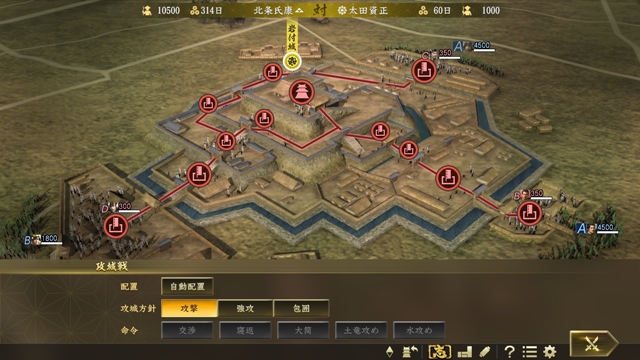攻城方要考虑到部队的配置与曲轮的数量与性质,并运用“土龙攻法”与“兵粮攻法”等多样攻城方式攻下天守。另一方面,守城方则要事前在位于敌军行军路线上的曲轮追加含有“橹”及“陷阱”等特殊效果的“设备”,强化稳固“天守”抵御敌军来袭。