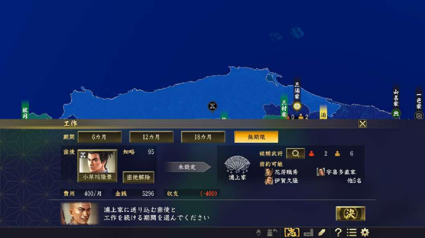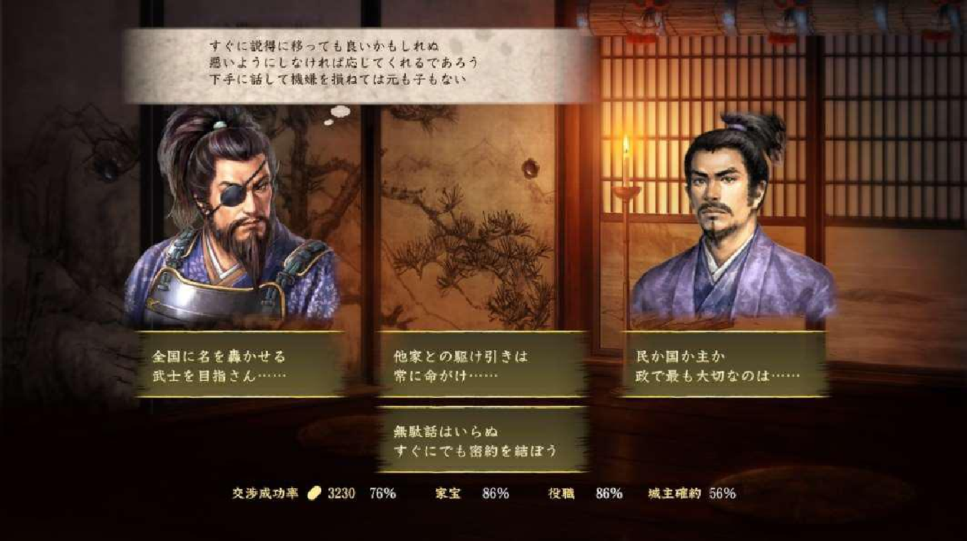 因为敌方势力也会进行调略,因此玩家可透过赐予家臣“传家宝”以及作为“恩赏”的“战功奖状”提高忠诚度进行防范。玩家可以向很少来访的商人购买传家宝,或利用攻陷据点后可以颁发的“战功奖状”来替代昂贵的传家宝。赐予的时机、对象、与内容将会是掌握人心的关键。