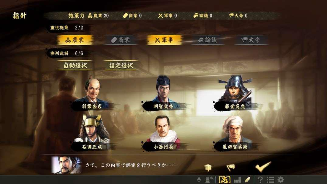 在获取发动大命所需之“施策力”的“评定”中,玩家可自由选择重视的系统以及列席评定的武将。此外,游戏开始后也将显示出所有可实行的“方策”,能计划性地强化自身势力。