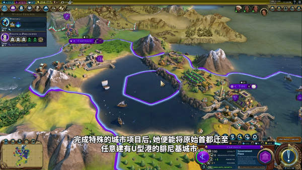 在城市中完成特色项目之后,腓尼基可将首都迁至拥有“U型港”的城市。建造“市政广场”区域和其中的市政广场建筑后可获得额外的贸易路线容量。在拥有市政广场的城市中建造区域时将获得生产力加成。