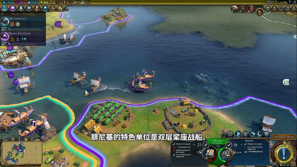 在游戏伊始便解锁“著作”科技尤里卡。与首都位于同一大陆、且由腓尼基所建造的海岸城市固定为绝对忠诚。开拓者上船后拥有额外移动力和视野范围,上下船不会消耗额外的移动力。
