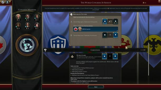 让世界其他领袖聆听文明的呼声。文明能从建立同盟、影响城邦、参与世界运动会等行为中获得外交支持。而外交支持可用于获取其他领袖的承诺、对决议投票、召集应对紧急状况的特殊议程,同时还能用于增加外交胜利投票的权重。