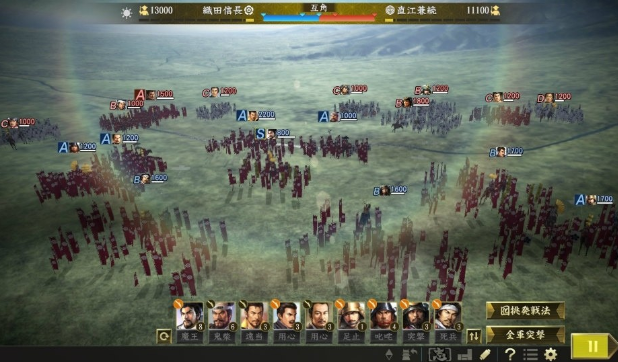 《信长之野望:大志》的决战系统原本是采用经典的回合制,本作加强版将追加可以实时切换的《真实时间制》模式,并追加了开战前决定战术的《军议》系统等新要素!