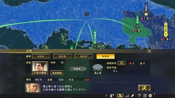 新追加广大玩家所期待的战略手段“调略”。可针对敌方势力执行“谍报行动”,与忠诚度低的武将接触并私下交涉。依据条件发现能进行密约的武将后就会收到报告,接着便能进行“密约”交涉。密约交涉首先能透过“闲话家常”提高我方印象,并可提出“城主条约”、“传家宝”、“金钱”等条件。因此,针对不同武将该准备哪些相对应的回礼,也是值得思考的部分。