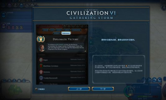 进入现代后,文明便能够在世界议会中使用外交支持来争取获得外交胜利点数。赢下决议向胜利前进,或阻止其他文明获得胜利。