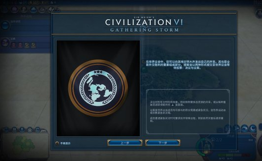 【世界会议】在世界会议中,玩家可以向其他文明发出自己的声音。其也是新外交胜利的重要组成部分。提案会以两种形式提交至世界议会等待投票:决议与议案。