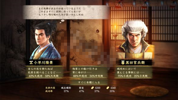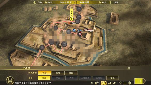 本作全新追加的“攻城战”中,除了以武力攻下天守之外,也能透过“城主交涉”进行胜负。攻城方可对守城方城主进行交涉,而交涉成功后不只可使守城方交出据点,还能使敌方将领投降,将伤害降至最低。不论是发挥兵力进行武力压制,或是采取巧妙交涉进行攻城,能使用丰富战术享受攻城战的乐趣。