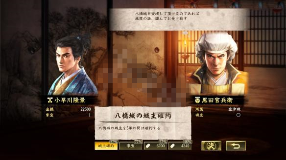 新追加广大玩家所期待的战略手段“调略”。可针对敌方势力执行“谍报行动”,与忠诚度低的武将接触并私下交涉。依据条件发现能进行密约的武将后就会收到报告,接着便能进行“密约”交涉。密约交涉首先能透过“闲话家常”提高我方印象,并可提出“城主条约”、“传家宝”、“金钱”等条件。因此,针对不同武将该准备哪些相对应的回礼,也是值得思考的部分。