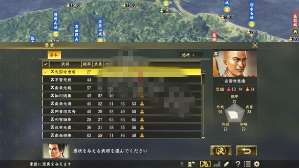因为敌方势力也会进行调略,因此玩家可透过赐予家臣“传家宝”以及作为“恩赏”的“战功奖状”提高忠诚度进行防范。玩家可以向很少来访的商人购买传家宝,或利用攻陷据点后可以颁发的“战功奖状”来替代昂贵的传家宝。赐予的时机、对象、与内容将会是掌握人心的关键。