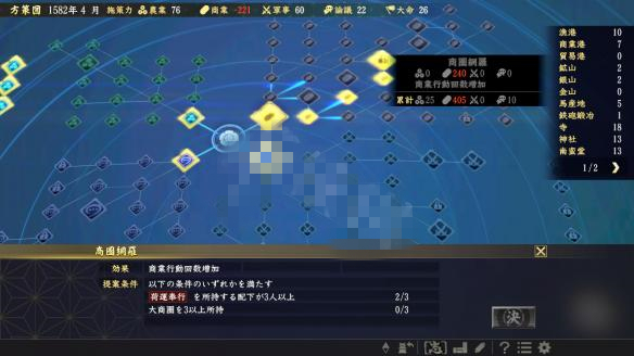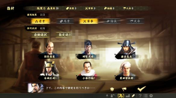 在获取发动大命所需之“施策力”的“评定”中,玩家可自由选择重视的系统以及列席评定的武将。此外,游戏开始后也将显示出所有可实行的“方策”,能计划性地强化自身势力。